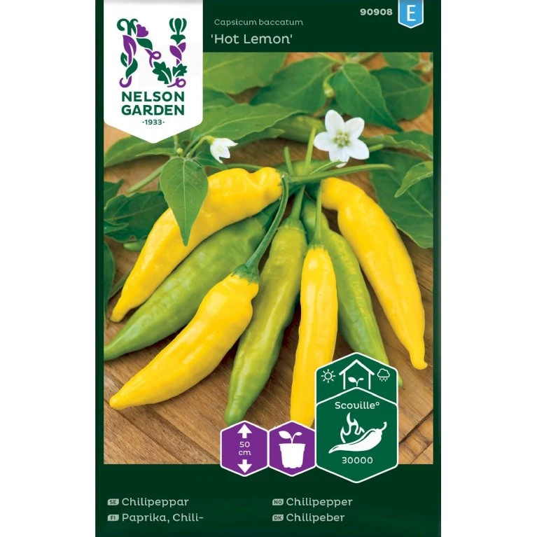 Spændende sort med duft og smag af citrus! Får ca. 4 cm lange, gule frugter, som er meget hotte. Fremragende til krydrede rejeretter. Fjern de brændende frø før spisning, brug en kniv og vask hænderne grundigt med det samme bagefter. God i potte på altan, balkon eller i drivhus. Gødes og vandes jævnligt.