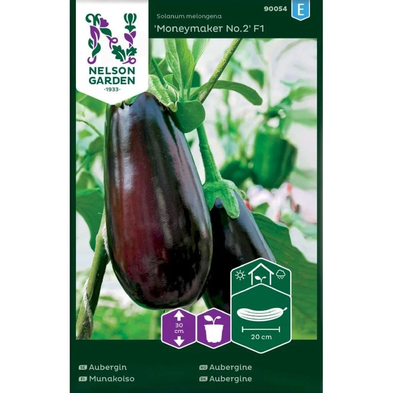 Aubergine er en varme krævende plante. Dyrkes i væksthuse eller udendørs på et meget beskyttet sted. Høstes løbende, ca. 5 måneder efter såning. Frugterne er aflange og mørkviolette. Bruges moussaka og grøntsags retter. Trives i frugtbar og veldrænet jord. Vandes regelmæssigt.