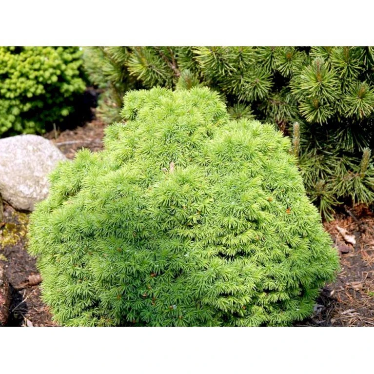 Lavt, kompakt nåletræ der får en tæt, rundagtig vækst. Bliver under normale forhold omkring 50 – 100 cm høj og 60 – 90 cm bred. Planten er meget langsomt voksende. Nåleene er blågrønne og bløde. Trives bedst i Sol. Kræver mellem gødning og er fuldt ud hårdfør under danske forhold. Velegnet på kirkegårde eller i stenbede.