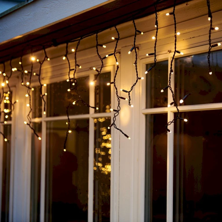 Iskrystal giver et varmt lysskær, og du kan hænge lyskæden i vinduer, gusgavle, altaner, carporte, hegn og træer.