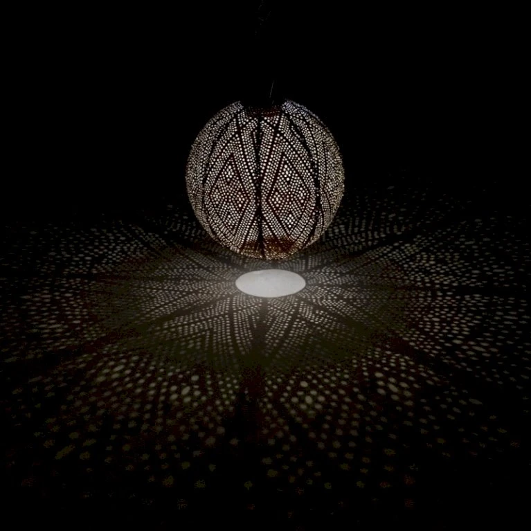 Lumiz solcelle lanterne rund 30 cm i kobber med mønsteret ’Ikat’, vil bringe et skønt, royalt look til din have eller din terrasse.
