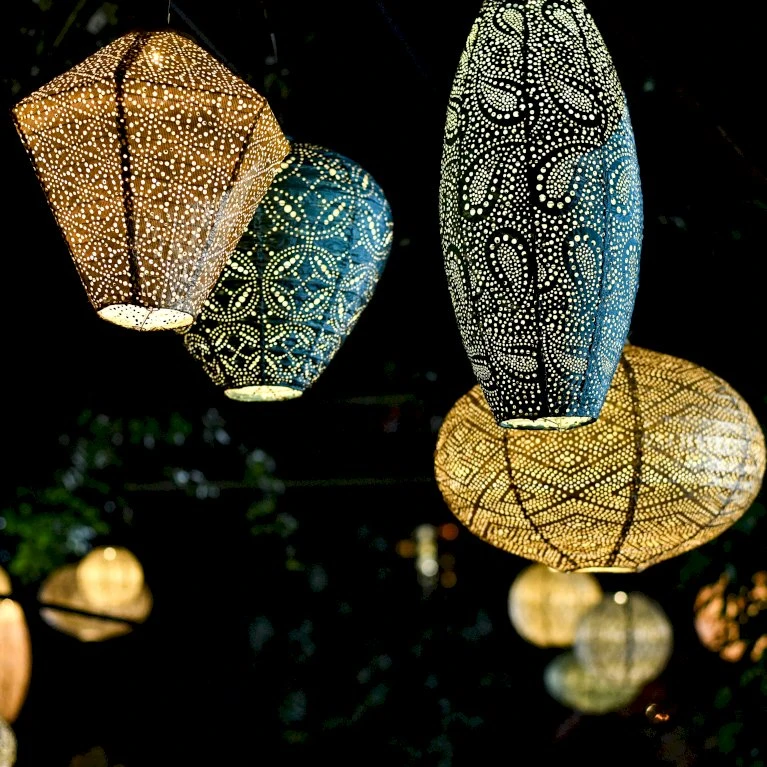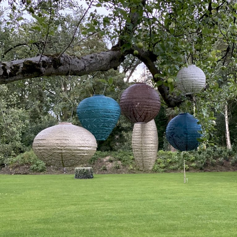 Lumiz solcelle lanterne ballon 30 cm i havblå med mønsteret ’Mandela’, er perfekt til at bringe et strandlook til din have.